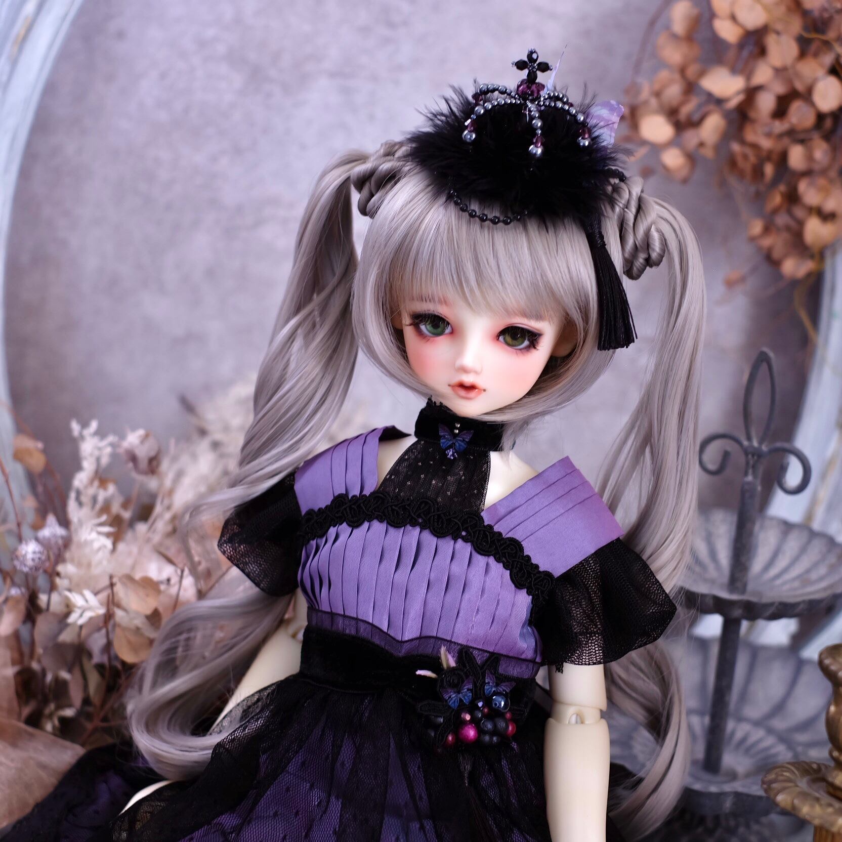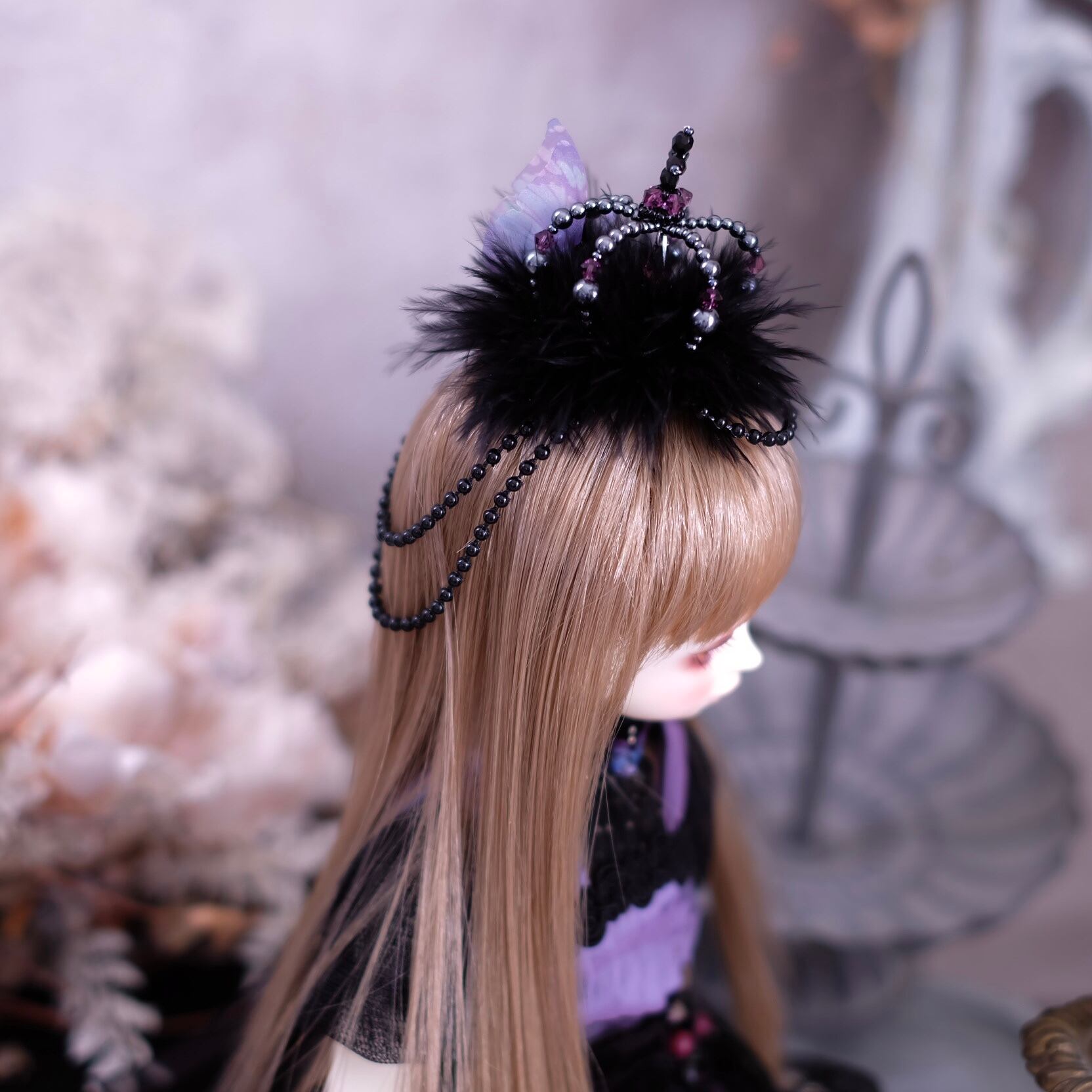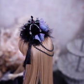 大小様々なダークシルバー色のパールを中心に、アメジスト色のクリスタルガラスのビーズも挿し色に使い製作しました。