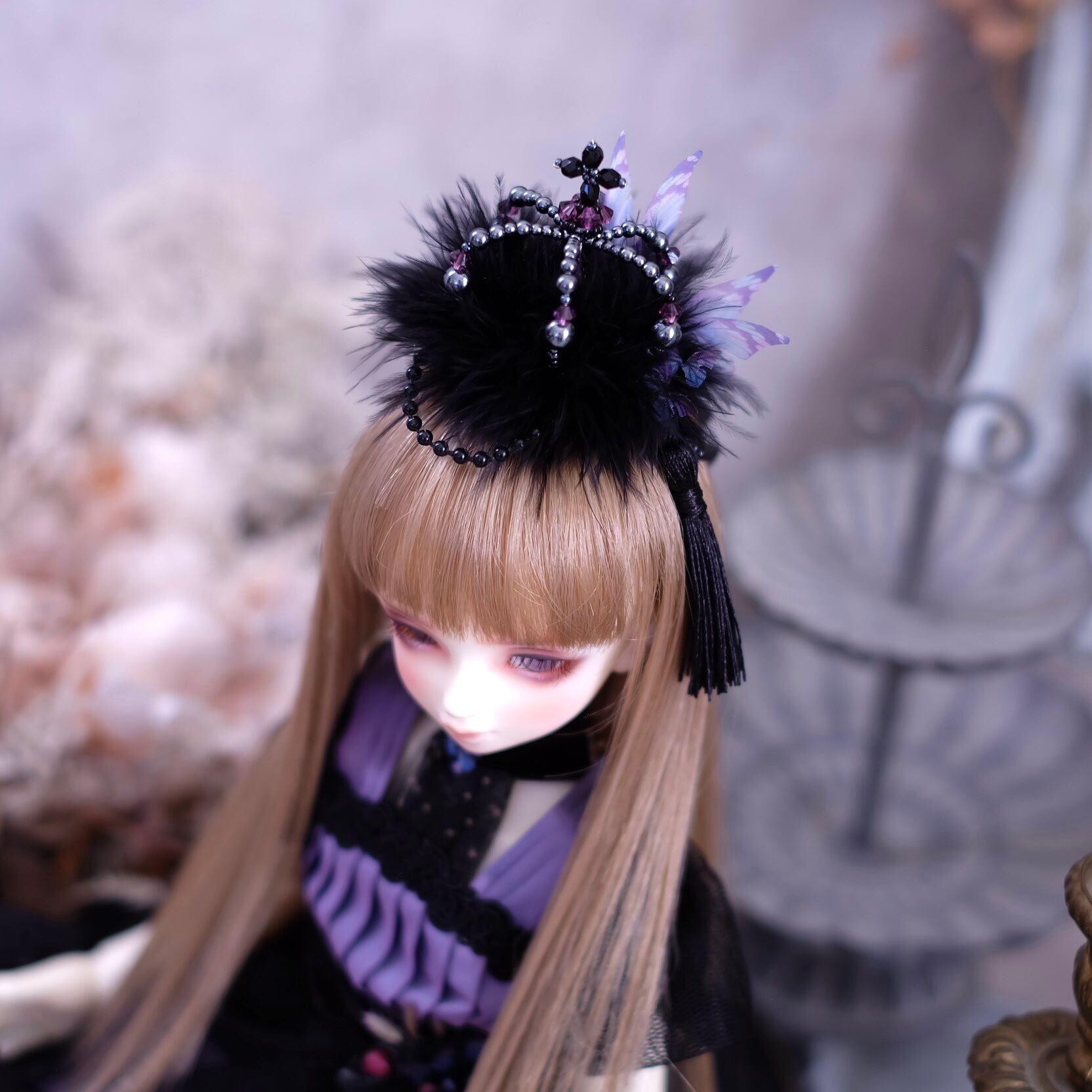 王冠の底にコームが付いていますので、ウイッグに挿し込んで装着してください。