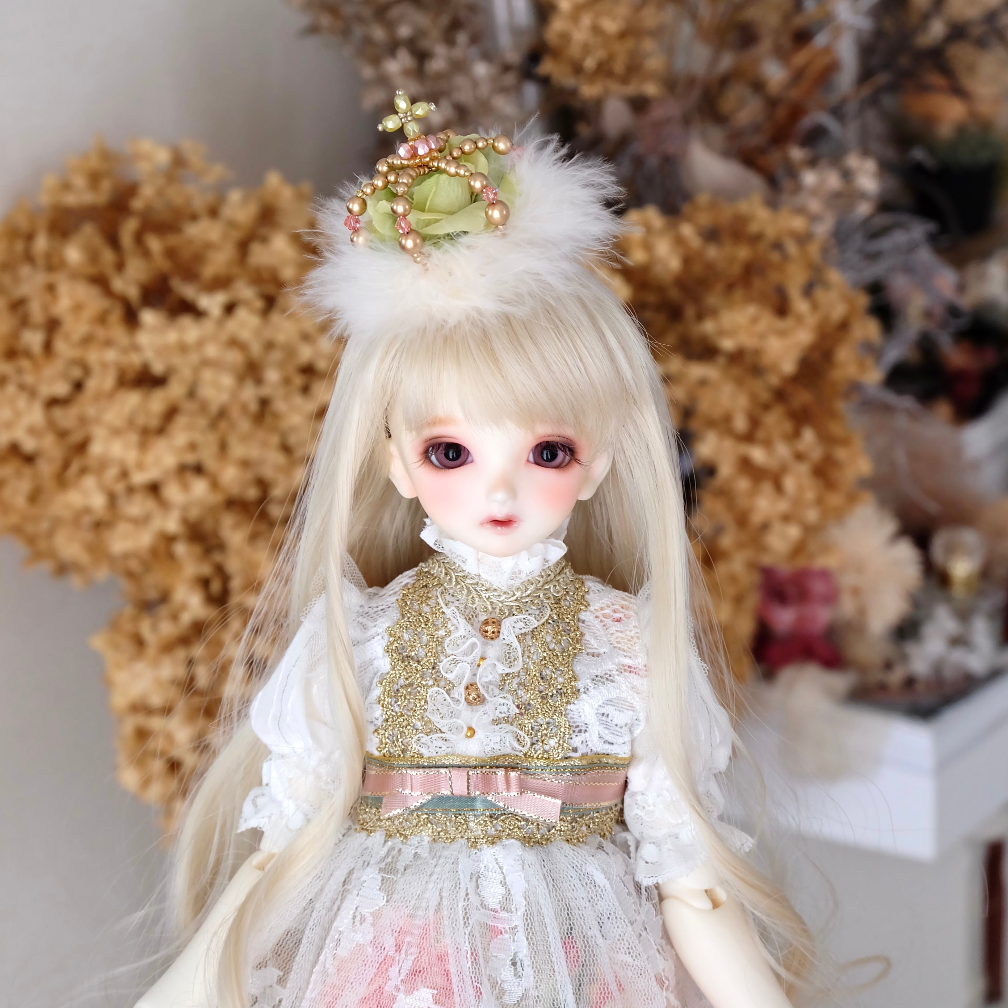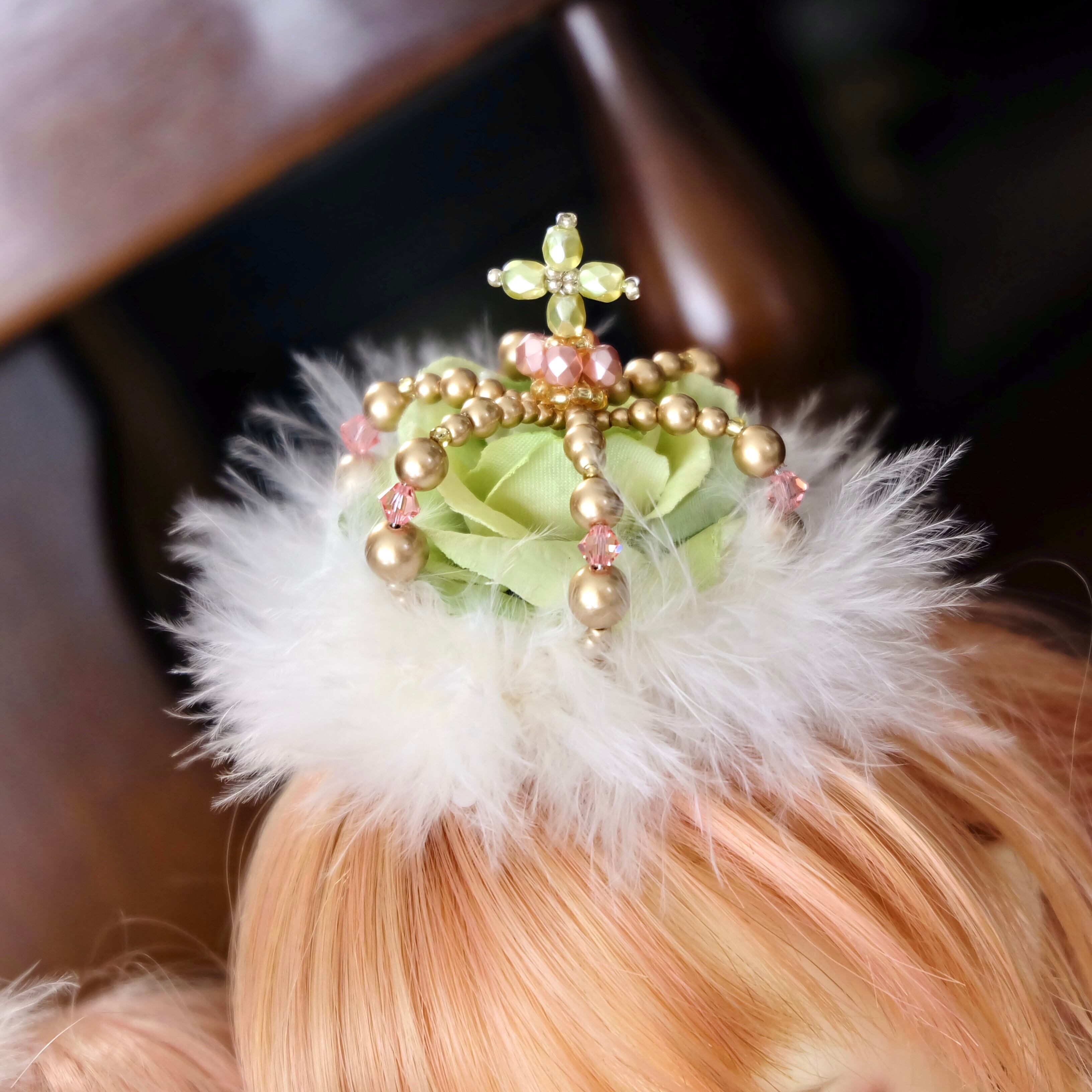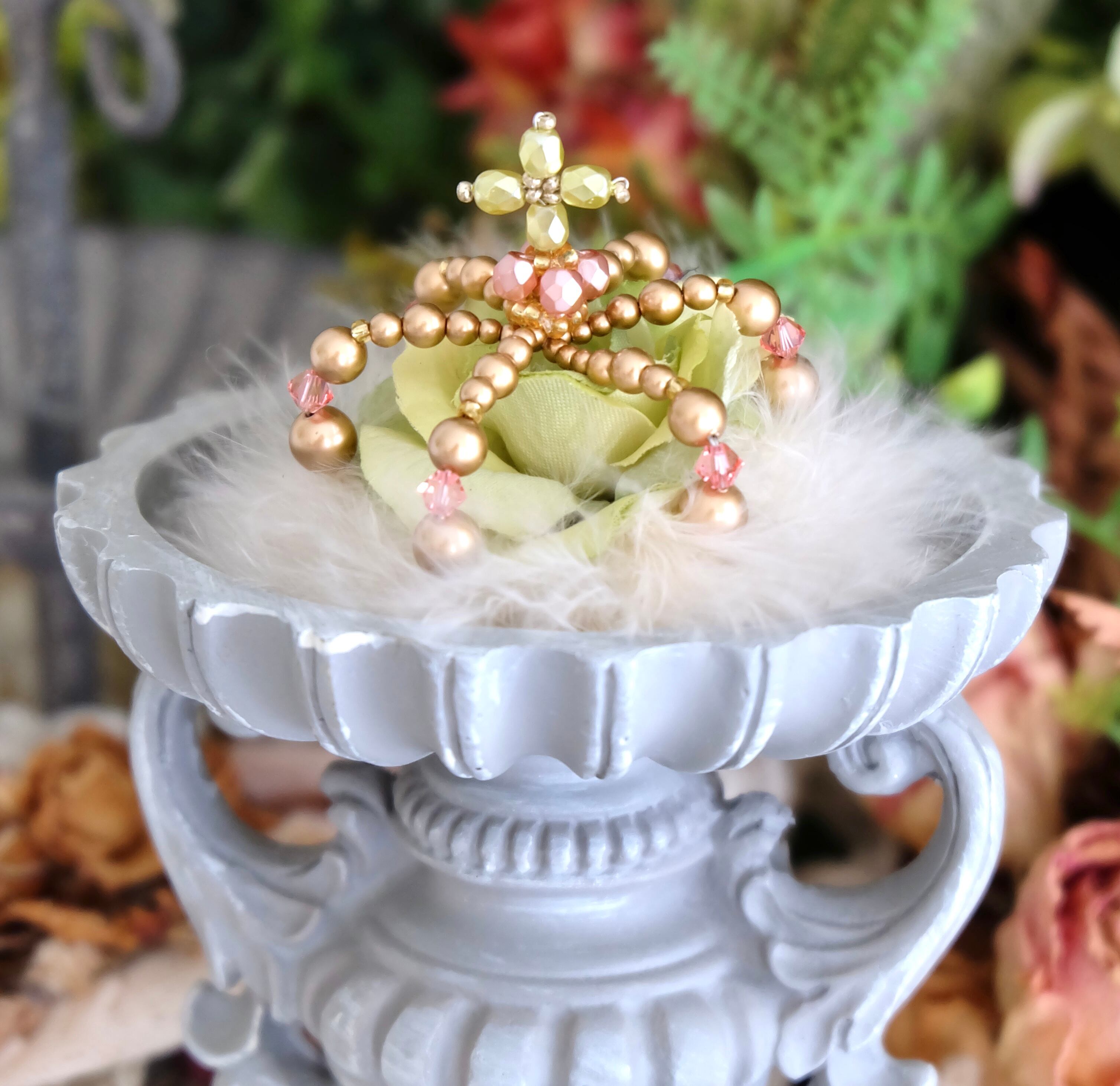 大小さまざまなパールやスワロフスキー社製ガラスビーズで創り上げました。