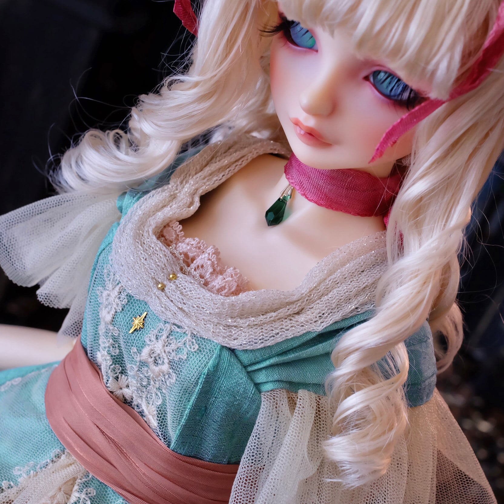 中央部分は刺繍レース越しに、下のスカートのキラキラとした生地が透けて見えます。