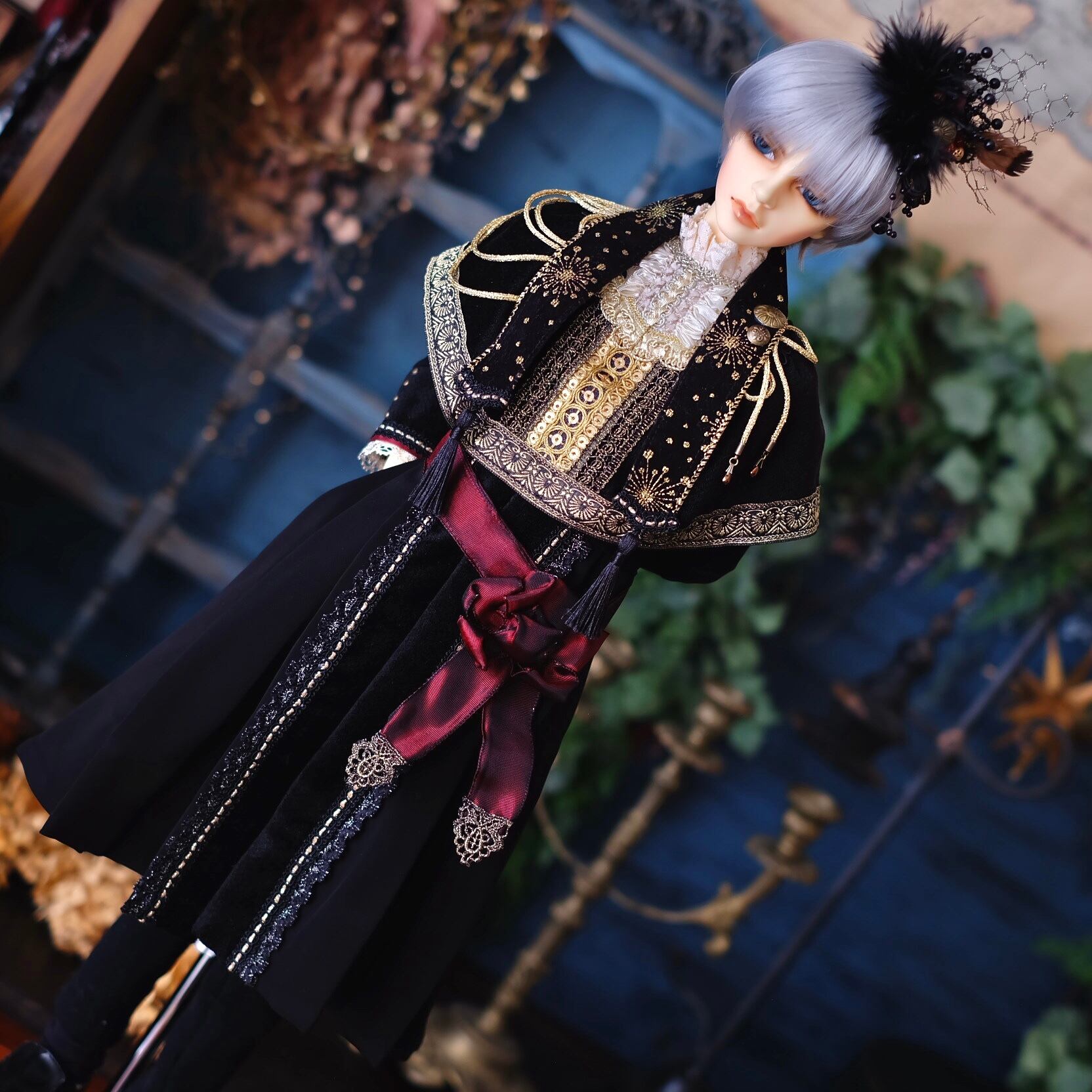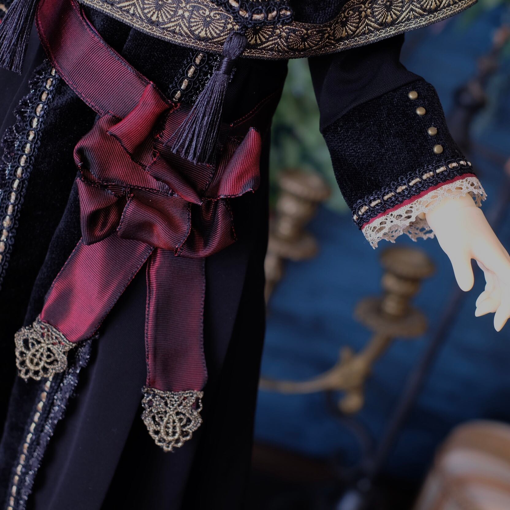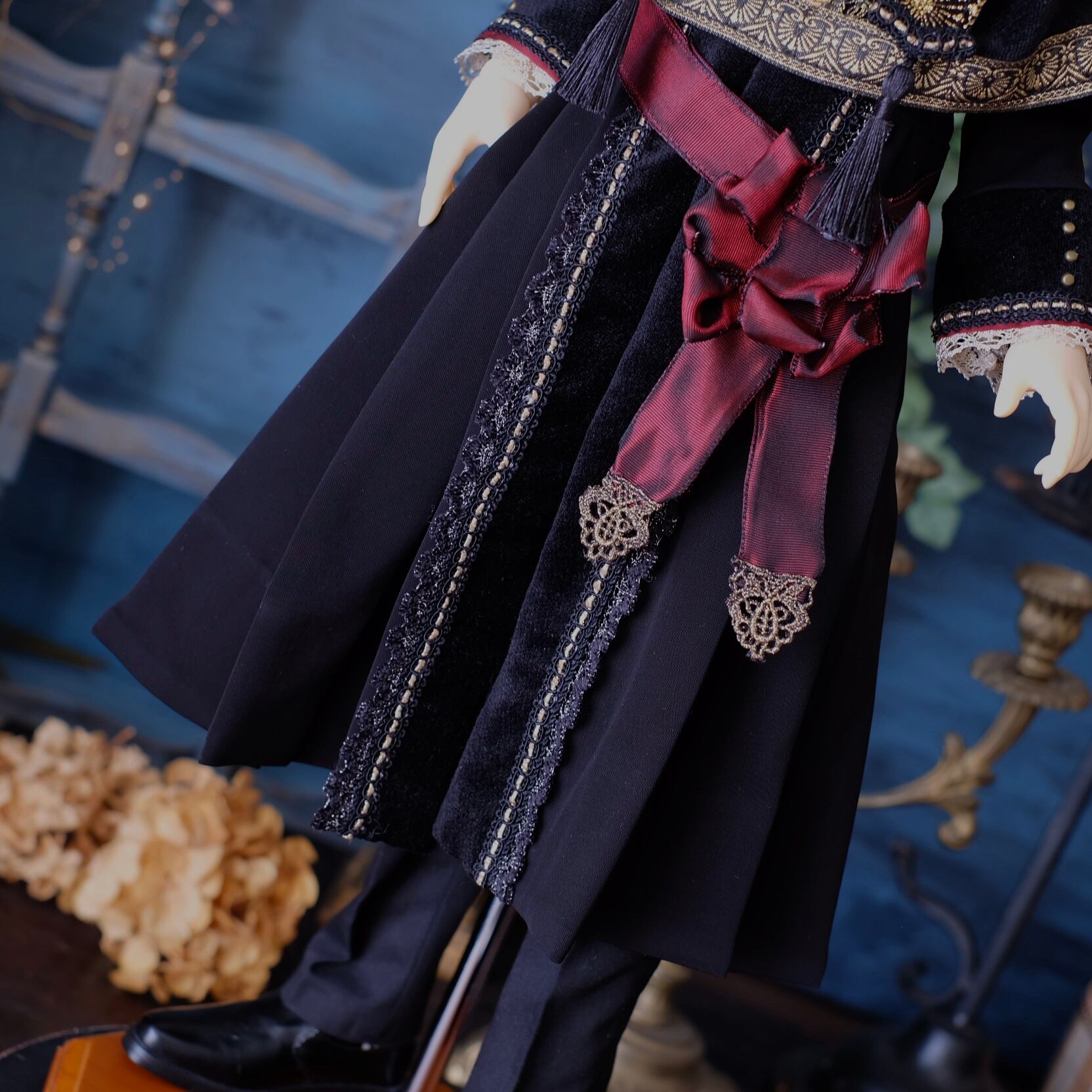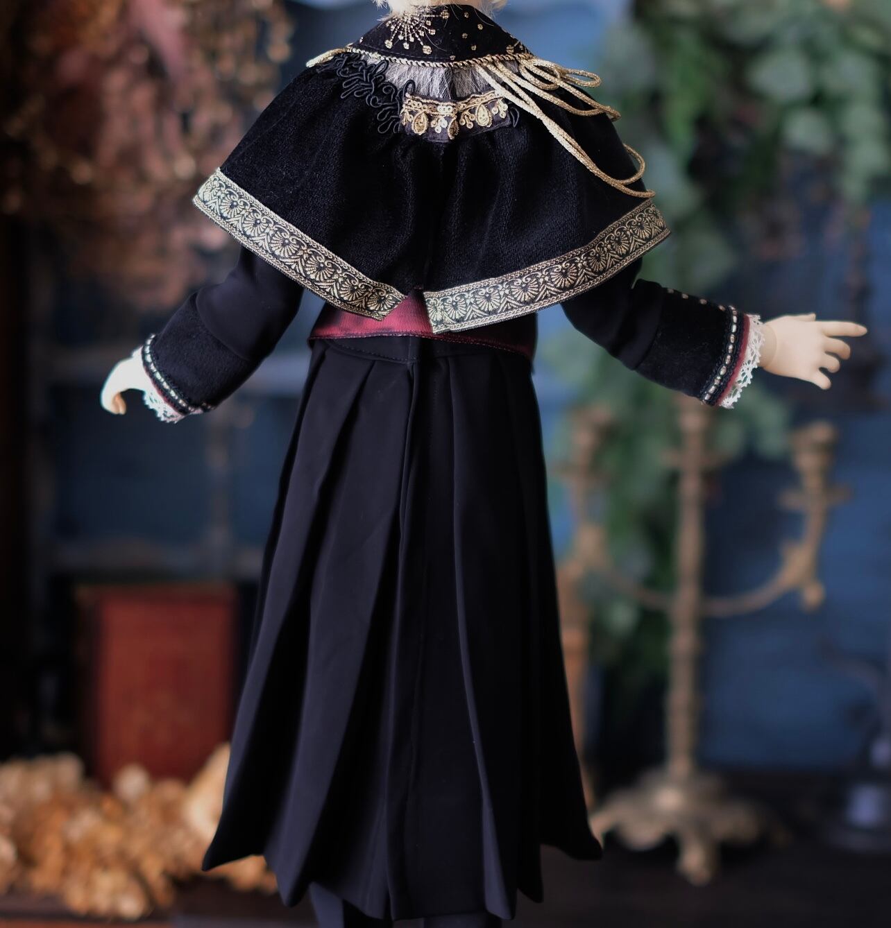しっとりとした肌触りの上質な黒生地をベースに、マント部分・袖・下部中央にはベロアを使用しています。